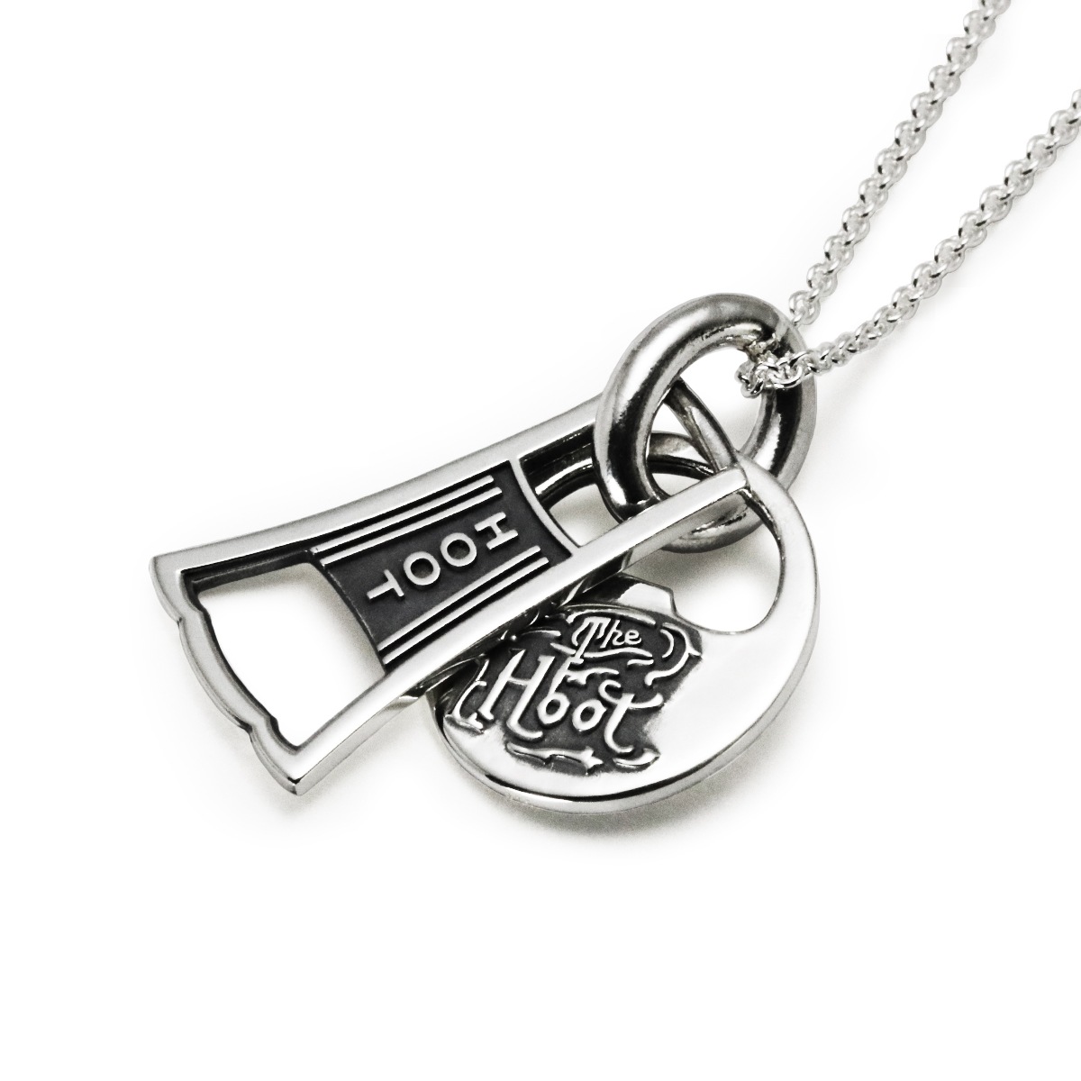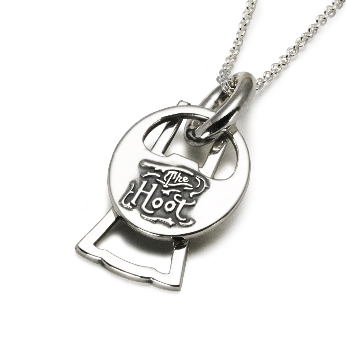 クラシックなHOOTロゴを配置したボトルオープナー型のプレートペンダント(OPENER PLATE)と、ヴィンテージのレザージャケットについていそうなジップスライダーをイメージし制作した(OLD ZIP PLATE)を組み合わせたペンダントトップ。
